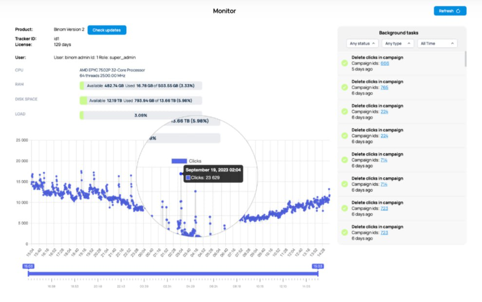 The tracker processes up to 260 million clicks per day without downtime, thanks to its optimized ClickHouse + PHP architecture. Critical for PPC or social campaigns where traffic explodes overnight. In tests with 100k+ clicks per hour, Binom never drops data and maintains 99.9% uptime. Pair it with proxy rotation for bulletproof stability and zero source-side IP bans.
