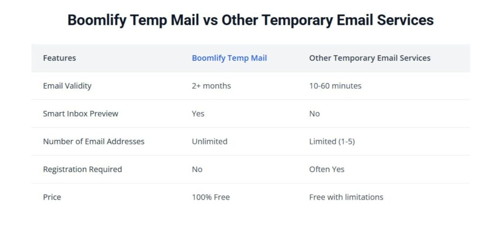 Most disposable email providers – often referred to as temporary mail services – are built for ultra-short-term use, focusing on quick generation and fast expiry to minimize server resources. This approach suits instant verifications but often falls short when emails arrive late or you need to check back later. Boomlify shifts the focus to long-term availability, giving you more breathing room for real-world timing issues without forcing constant recreations.