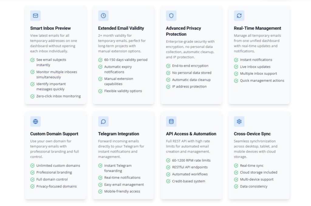 For more advanced setups, Boomlify includes a REST API with solid rate limits (up to 1200 requests per minute on top plans), where credits apply only to new creations. Telegram forwarding routes messages directly for instant mobile notifications, and custom domain support (up to 20 on higher plans) allows branded addresses that maintain professionalism during testing or campaigns.