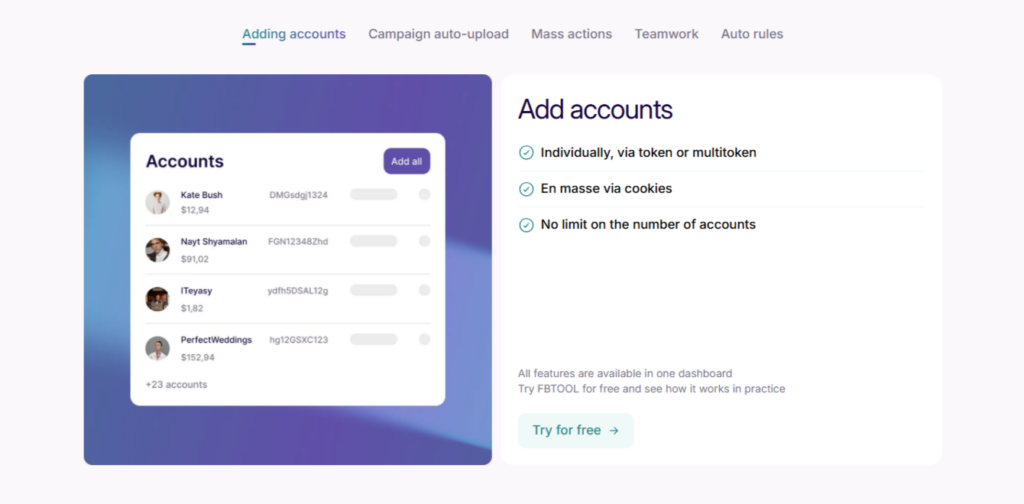 FBTOOL is often used by teams working with several ad accounts simultaneously. The service helps centralize control and reduces the time spent switching between accounts.