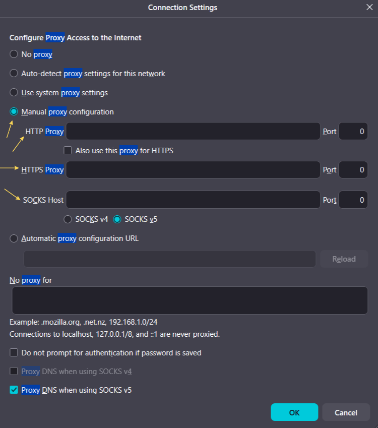 Add your network’s IPs or domains (e.g., 192.168.0.0/16, localhost) to the No Proxy for field.