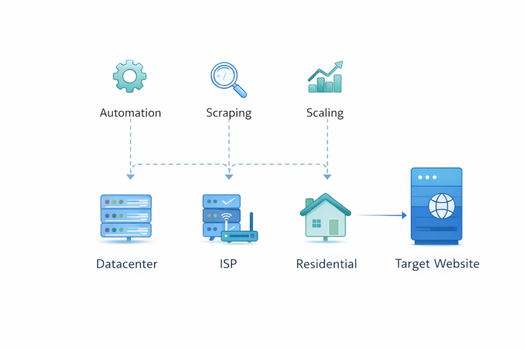 The stability of an infrastructure therefore depends not only on the type of IP addresses being used but also on how they are managed overall. In automation and scaling environments, different proxy types are often used together – for example datacenter, ISP, and residential proxies. Each of them is suited for different scenarios and solves a specific part of the workload.