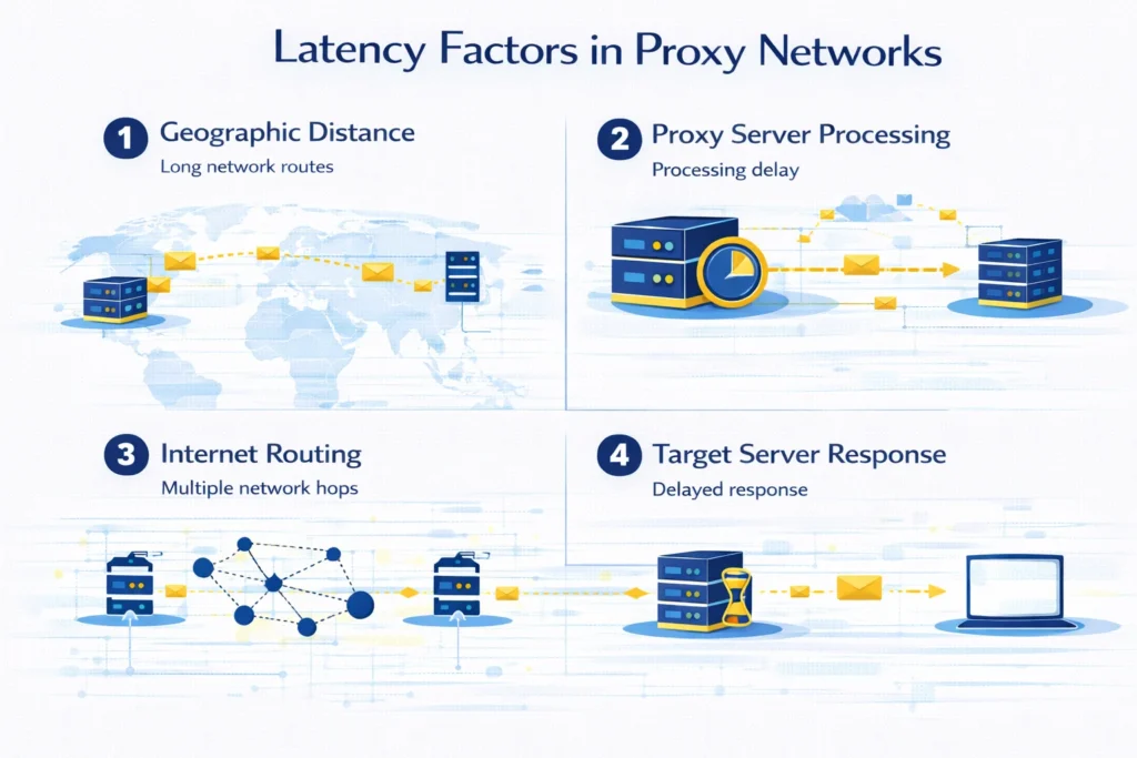 Proxy latency does not depend on a single factor. Instead, it is influenced by multiple network conditions.