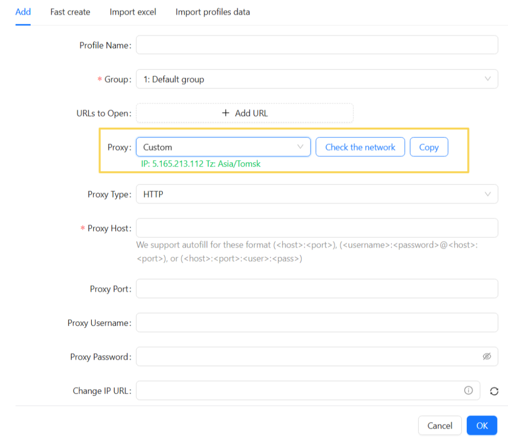 The proxy configuration interface allows users to specify the supported protocol and enter connection details manually or in a combined string format. That flexibility lowers the entry barrier when teams onboard new proxies or shift environments between tasks.