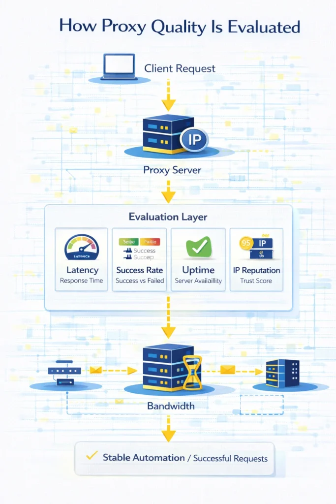 Proxy performance can be evaluated by measuring latency, verifying connection stability, and analyzing IP reputation before deploying proxies into production systems.