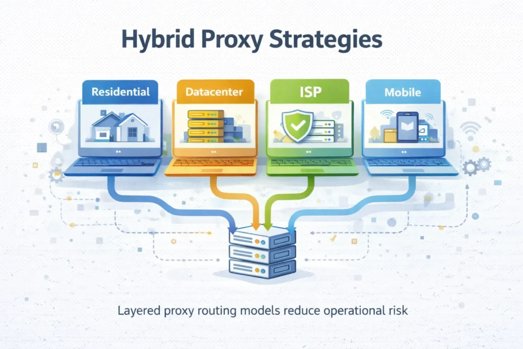 Modern automation architectures rarely rely on one proxy category alone. Instead, teams design layered proxy routing models.