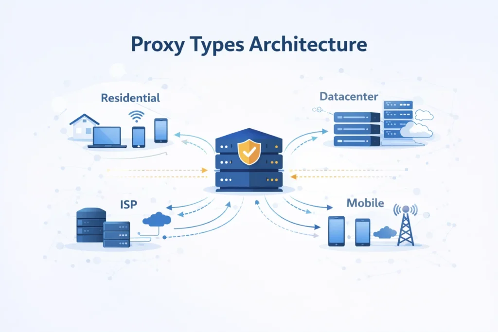 This guide explains how the main proxy categories work, compares their technical characteristics, and helps you determine which proxy type is most suitable for specific tasks.