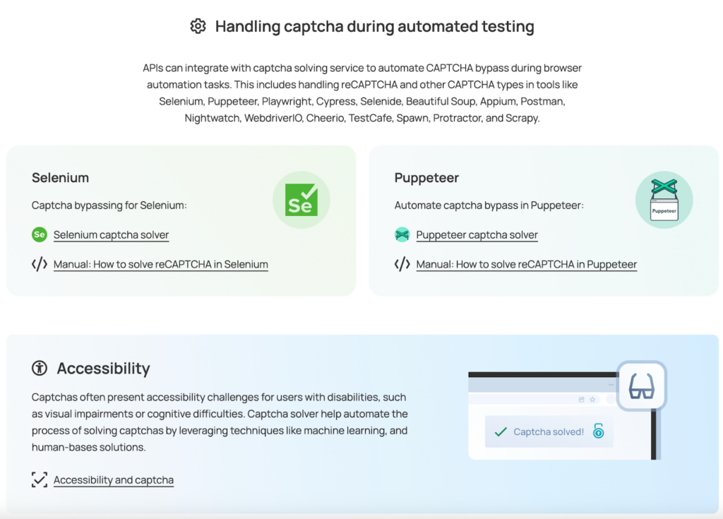 Integrations with Selenium, Puppeteer, and Playwright have ready examples in documentation — from detecting CAPTCHA container in DOM to token substitution in the form.